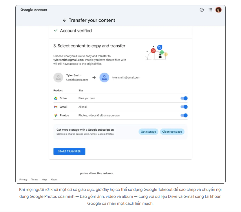 Thấu hiểu điều này, Google cập nhật thêm tính năng Google Takeout Transfer hỗ trợ chuyển đổi cho cả Google Photos. Giờ đây, khi khoác lên mình chiếc áo cử nhân, bạn có thể dễ dàng “chuyển nhà” cho toàn bộ kho ảnh, video và album thanh xuân từ tài khoản của trường sang tài khoản Gmail cá nhân để lưu giữ mãi mãi.